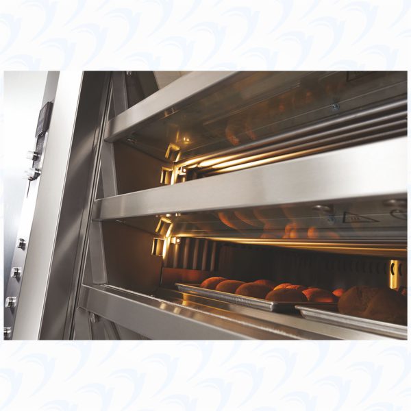 The mura mini steam tube oven is a static oven which means there are no fans to dry out your baked goods. The most important characteristic of this oven is the unique heating system. Heat is supplied by a dense network of closed vapour tubes in which hot steam circulates. The baking chambers on each deck are wrapped by these vapour tubes in and around the entire deck, each steam tube is individually tested and certified at our factory. This unique concept of heating steam tubes provides our customers with low energy consumption, quick temperature recovery and the perfect uniform bake every time. The oven is so energy efficient that after 12 hours of the oven turned off, it still holds 120C. High quality stainless steel is used on the entire outside & inside of the oven for easy cleaning and look. Each deck has its own powerful selfcontained high capacity steam system that is ready on demand for artisan breads, bagels and rolls. The mura mini steam tube oven with refractory baking surface is ideal for hearth baking and you can also bake in regular trays. This oven is perfect for all types of products such as breads, rolls, pies, pastries and pizza’s.